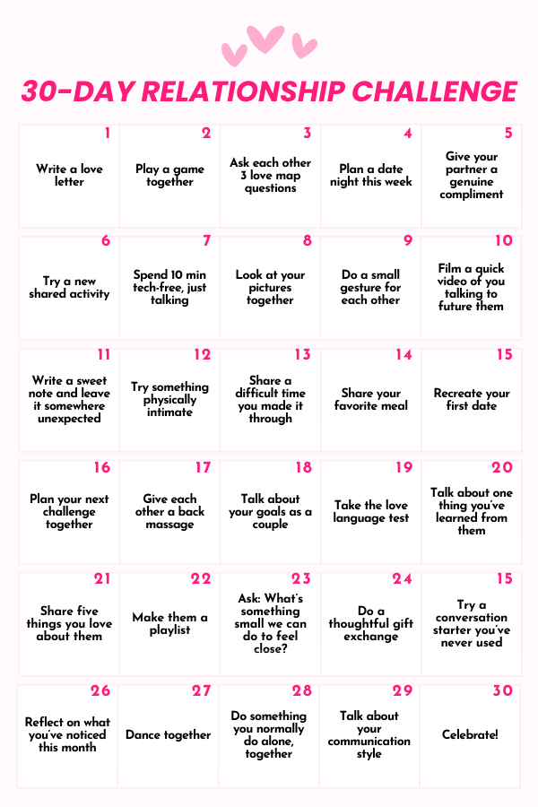 This 30-day relationship challenge is all about dedicating a small amount of time to made a huge positive impact on your relationship! Your individual actions plus days of connection-creating activities are the way to rekindling a spark, building a better marriage, and / or learning how to communicate better with your partner. This is your next towards a healthy relationship, with new things to try, better communication tips, and ways to express fondness every single day.